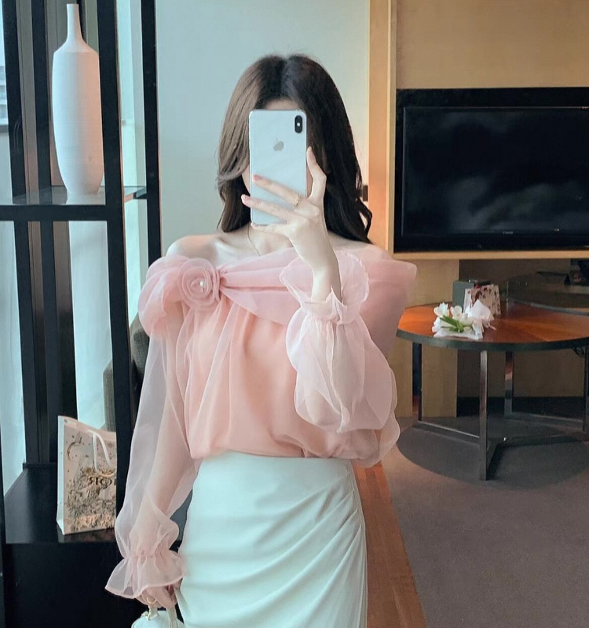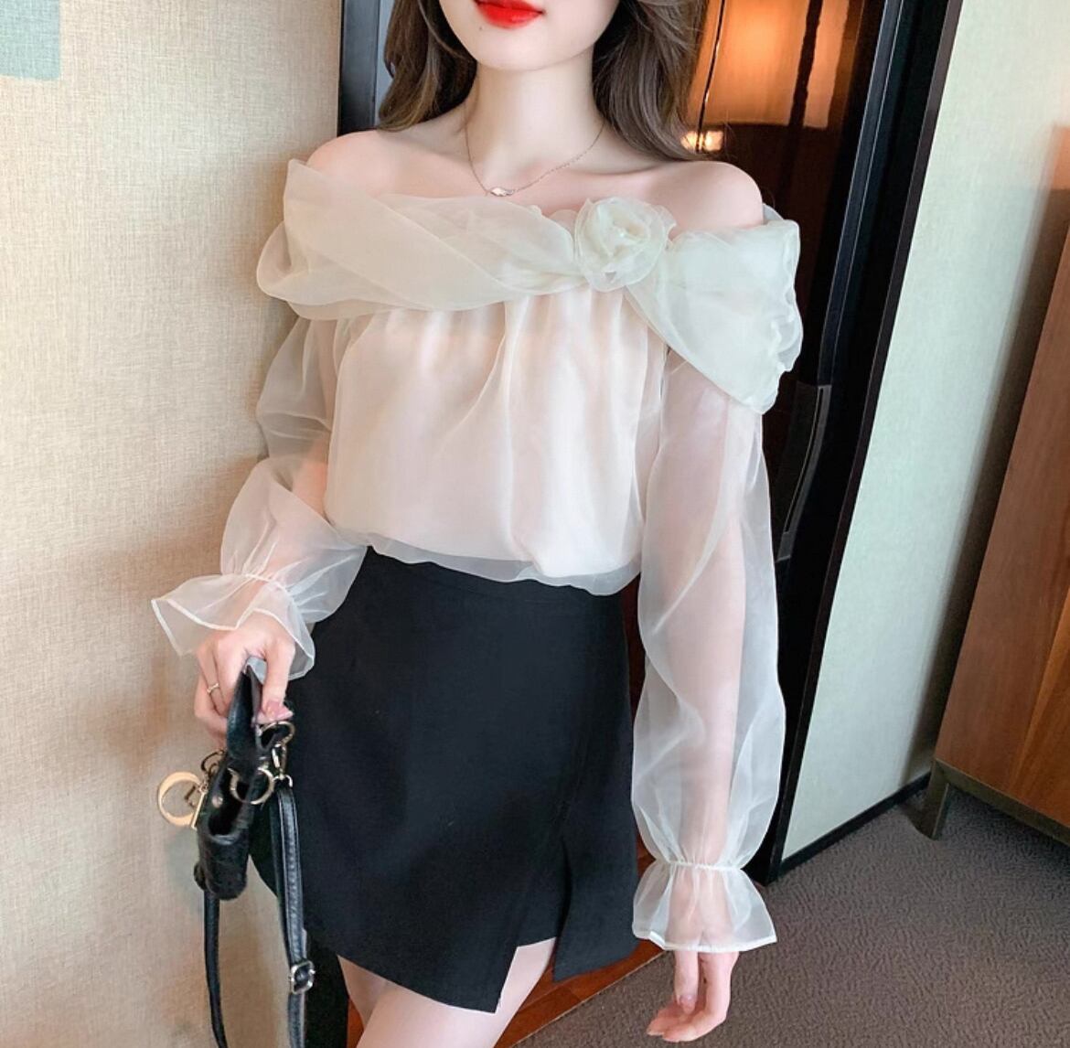 ふんわりとしたオーガンジー素材と、大胆なオフショルダーデザインが魅力的なブラウス。肩元のローズモチーフが、華やかさをプラスします。