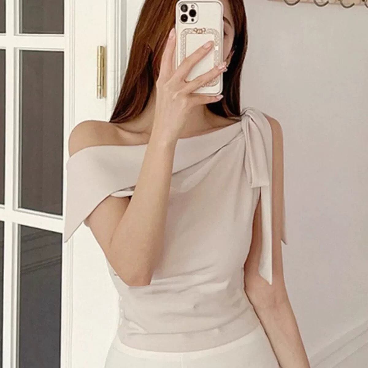 片方の肩にリボンを結ぶデザインがポイントの、アシンメトリーなブラウス。上品なドレープが、女性らしいシルエットを演出します。
