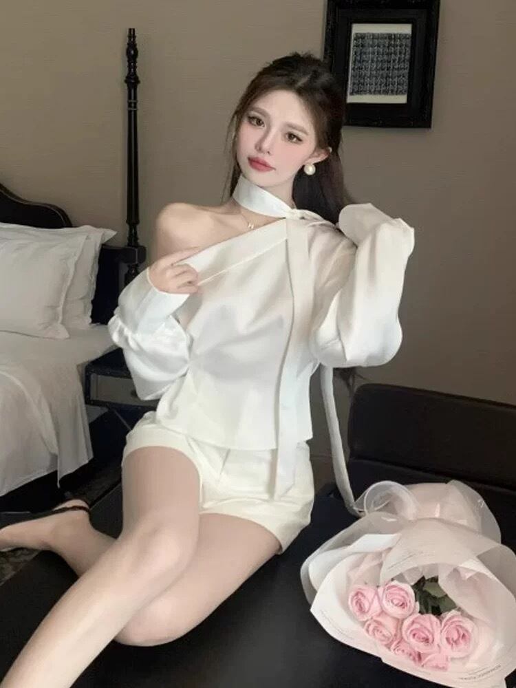 アシンメトリーなネックラインと、タイデザインが印象的なブラウス。片方の肩を大胆に露出することで、女性らしい抜け感を演出します。上品な光沢感のある生地が、エレガントな雰囲気をプラス。結び方次第で様々な表情を見せるネックタイが、コーディネートのアクセントになります。