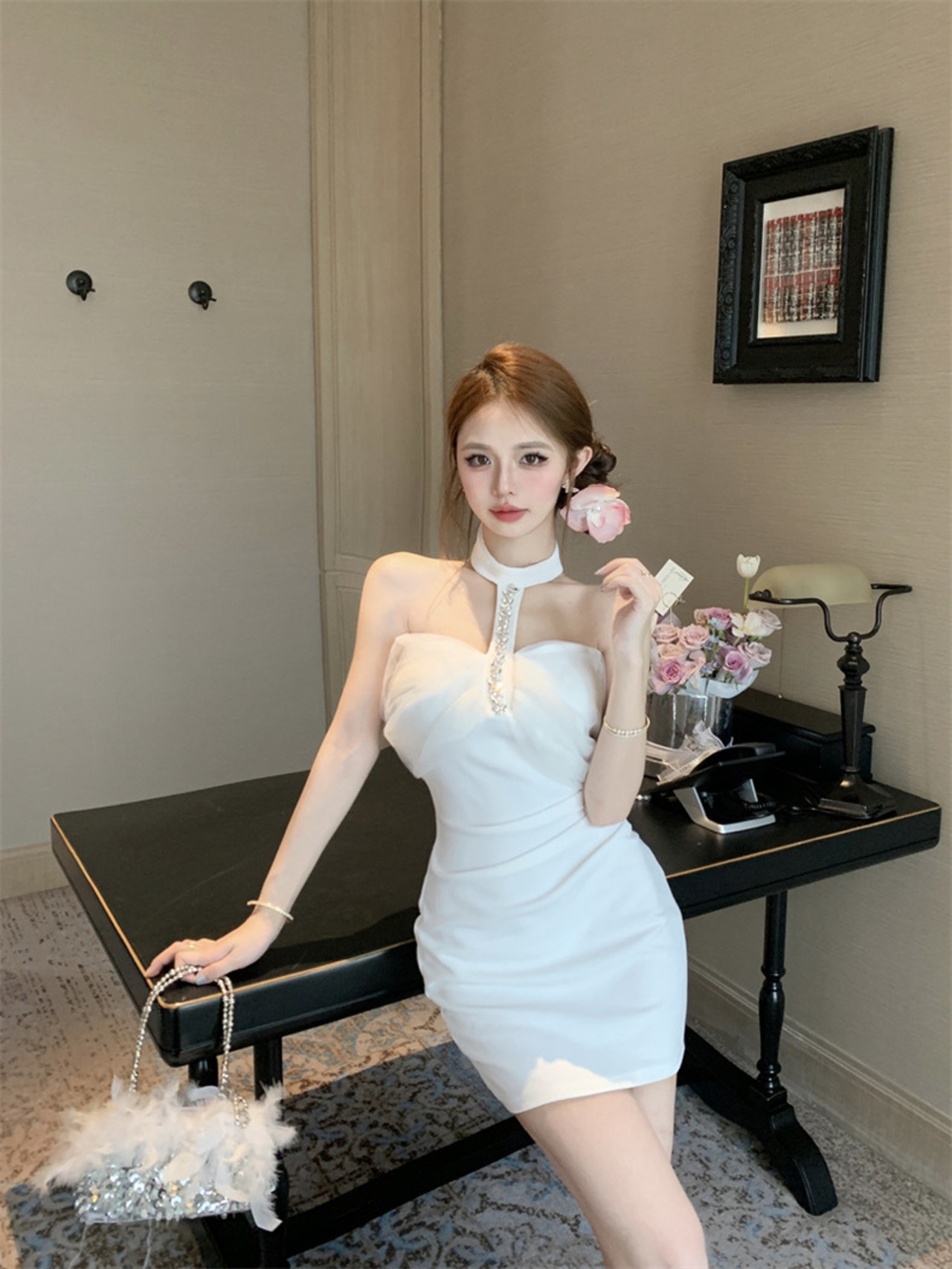 シンプルでありながら華やかさを兼ね備えた「銀河ワンホンドレス」は、夜空のように深いブラックカラーが特徴的な一着です。胸元には美しいラインストーンが並び、まるで星々が輝く銀河を思わせるデザインです。ハイネックのディテールがエレガントさを引き立て、体にフィットするシルエットがスタイルを美しく見せてくれます。
