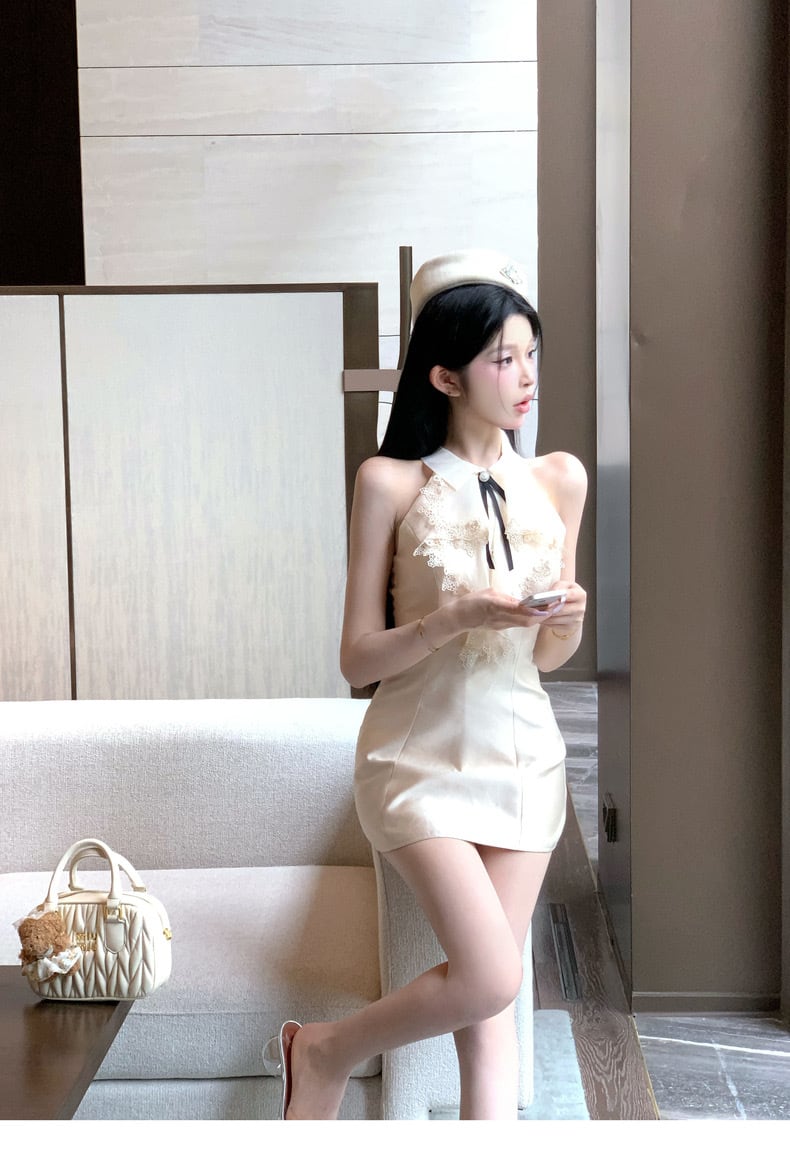 「琥珀光ワンホンドレス」は、クラシカルな雰囲気とモダンなエレガンスを兼ね備えた一着です。シャンパンカラーのサテン生地が、琥珀のように柔らかな光を放ち、着る人の魅力を引き立てます。胸元には繊細なレースのフリルとリボンがあしらわれており、女性らしいディテールが満載です。