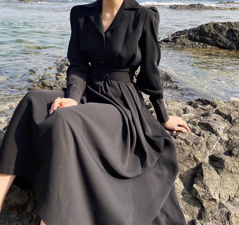 ウエスト部分にはベルトが付いており、シルエットを美しく引き締めます。Vネックとフロントボタンが、上品さとモダンさを絶妙に融合させたデザインです。長めの丈が大人っぽさを演出し、どんなシーンにもマッチします。